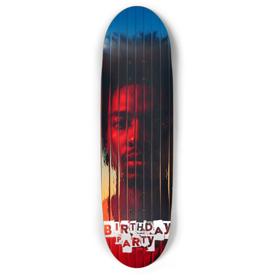 A vibrant skateboard deck featuring a bold design with a silhouette of a person against a gradient background transitioning from blue to red, evoking a sunset or sunrise effect. The deck is accented with "BIRTHDAY PARTY" text in a distressed white font at the bottom, adding a festive and edgy touch. Perfect for skate enthusiasts and unique gift seekers!