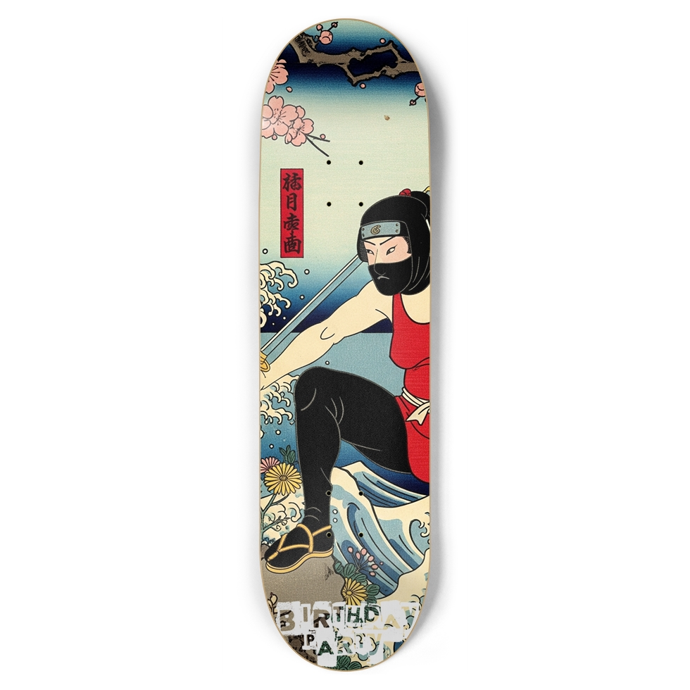 This skateboard deck features a bold Japanese-inspired design with a ninja in red wielding a sword on a wave, accented by cherry blossoms and floral details. Red and black Japanese characters add flair, while "BIRTHDAY PARTY" in white graffiti-style text at the bottom gives a modern twist. Ideal for skate enthusiasts and collectors!