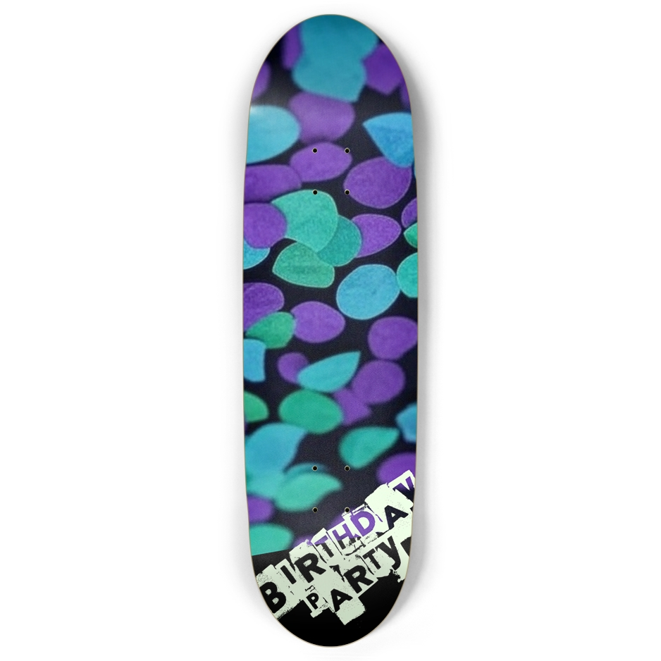 Super vibrant abstract pattern. The background of the graphic is black, and it's covered with numerous teardrop-shaped or petal-like splotches in shades of teal/turquoise and purple. Towards the bottom of the deck, in a white, paint-splattered block, the words "BIRTHDAY PARTY"