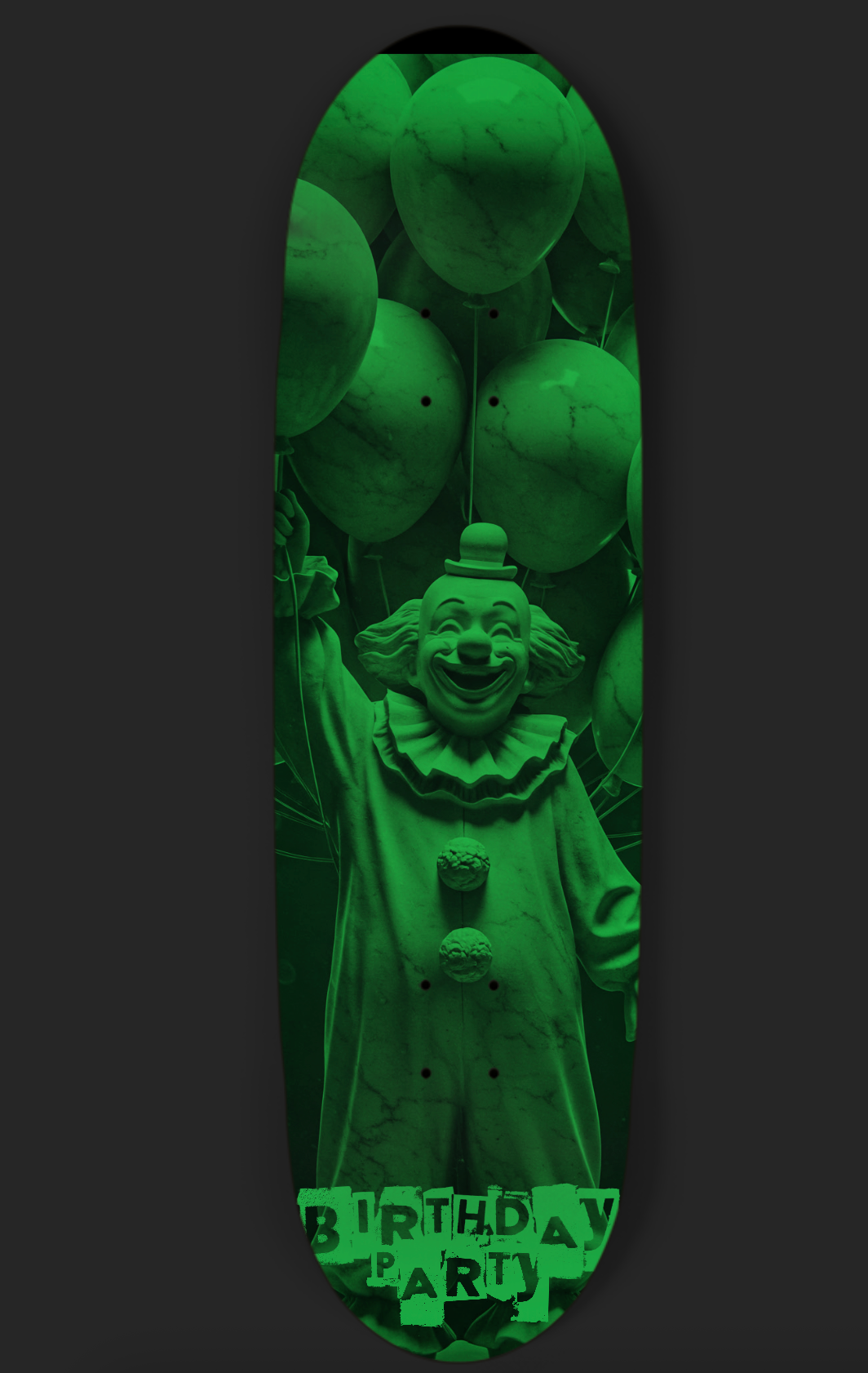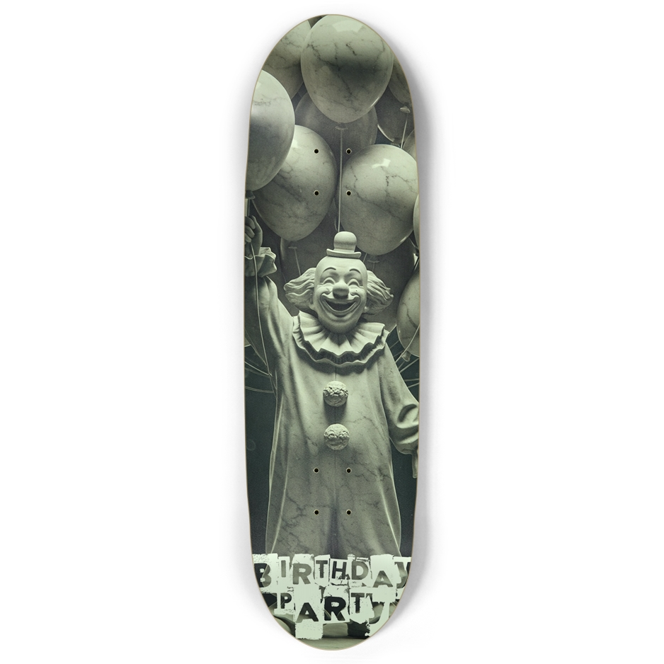A unique skateboard deck featuring a surreal design of a marble-textured clown holding a cluster of marble-like balloons. The deck is accented with "BIRTHDAY PARTY" text in a distressed white font at the bottom, adding a festive and whimsical touch. Perfect for skate enthusiasts and unique gift seekers!