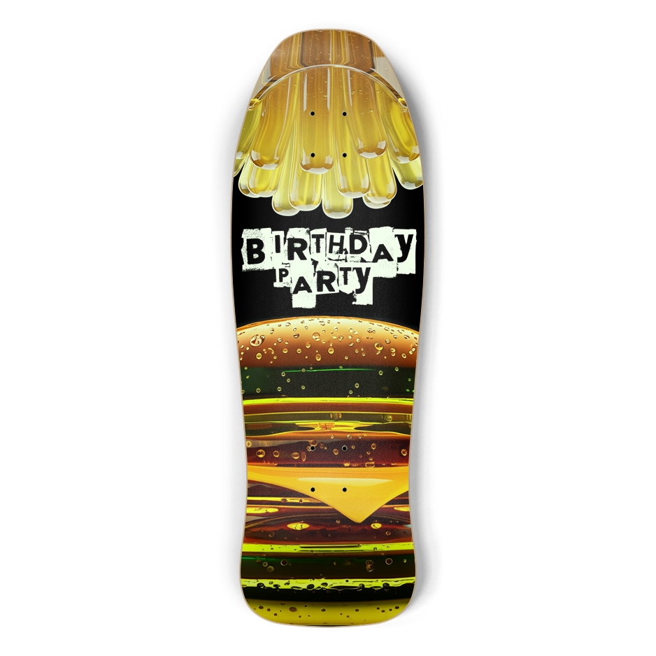 Introducing the ultimate glow in the dark statement piece for any skate enthusiast and McDonald's aficionado – the "Birthday Party" Skateboard Deck. This isn't just a deck; it's a hyper-realistic, mouth-watering masterpiece that brings your favorite fast-food cravings to the streets. 7-Ply 100% Canadian Maple Deck with High Resolution graphic applied.