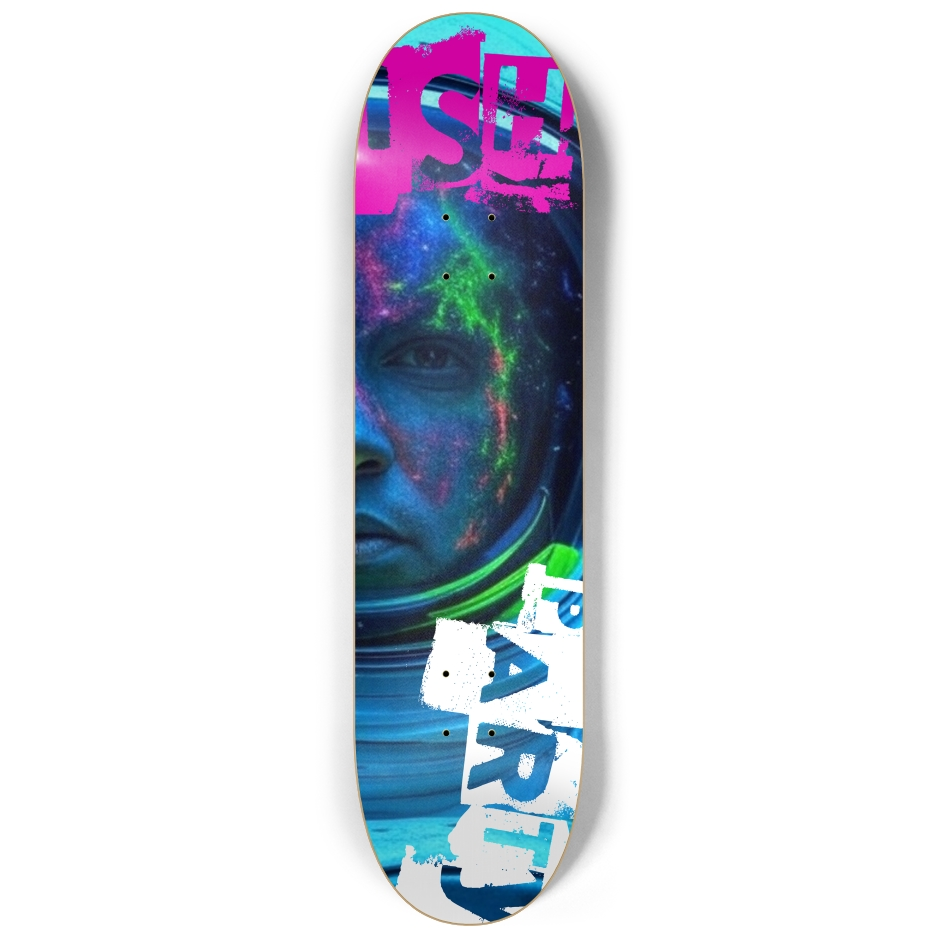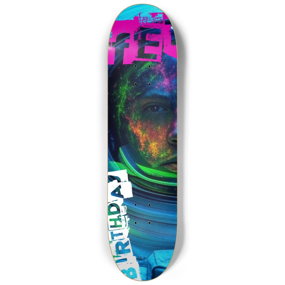You're about to embark on an out-of-this-world journey with our "Future Baby Pluto" Skateboard Deck! This isn't just a deck; it's a cosmic canvas featuring a captivating split image of an astronaut's face, bathed in vibrant neon purples, greens, and oranges, reminiscent of a distant galaxy.